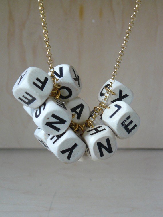 Natalie Jacob, originally from Brooklyn, NY hand makes all of her pieces for her jewelry line Etymology from reworked vintage jewelry and/or old board games, reminding us all not to take ourselves too seriously. Thanks Natalie!